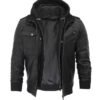 Mens Black Leather Jacket with Removeable Hood
